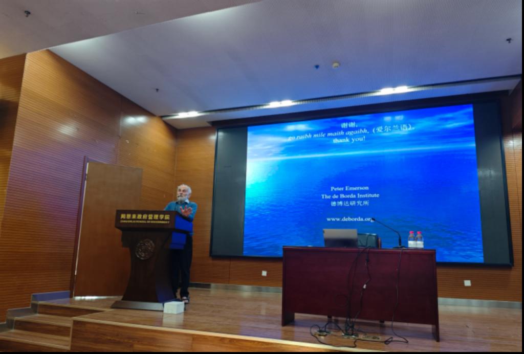2025年4月22日,太阳集团tcy8722“翔宇讲堂”首期特邀北爱尔兰德博达研究所(The de Borda Institute)所长彼得·爱默生(Peter Emerson)做客太阳集团tcy8722,在公司128报告厅举办“Binary Voting: Maybe We All Got It Wrong”(二元投票制:或许我们都误解了)的专题讲座。讲座由政府公司杨龙教授主持,公司部分教师、员工参加讲座。