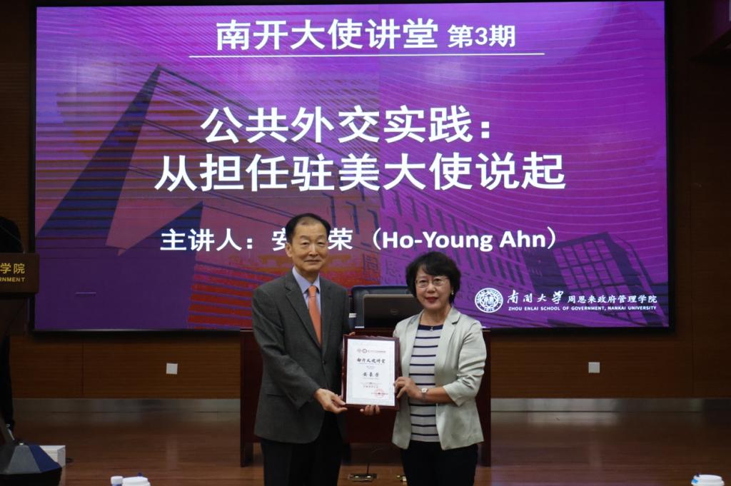 讲座伊始,党委书记王慧为安大使颁赠了“南开大使讲堂第3期”主讲纪念奖牌。张发林教授向与会师生简要介绍了安大使的外交生涯,安豪荣曾任韩国驻美大使、韩国外交通商部第一次官、韩国驻欧盟和比利时大使,他长期致力于推动韩美战略沟通与多边合作,在国际外交实践与政策研究领域具有深厚造诣,其丰富的对美公共外交经验将为在场师生带来宝贵启示。