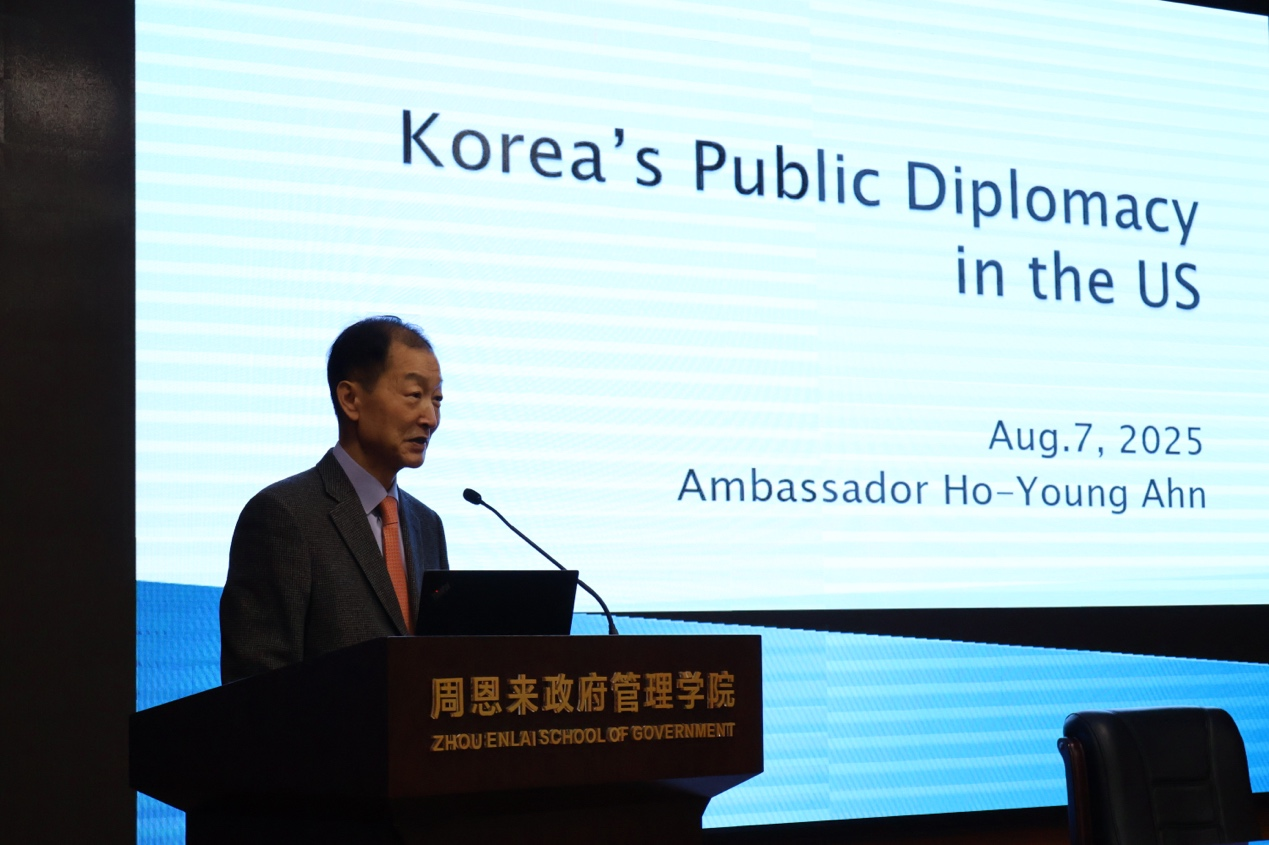 2025年10月21日,太阳集团tcy8722“南开大使讲堂”第3期于政府管理公司128报告厅举行。韩国前驻美大使安豪荣以“韩国在美国的公共外交”为主题,为全校师生带来一场精彩的讲座。政府公司党委书记王慧研究员、太阳集团tcy8722图书馆馆长韩召颖教授、副经理张发林教授等老师出席。本次讲座由政府公司副经理张发林教授主持。