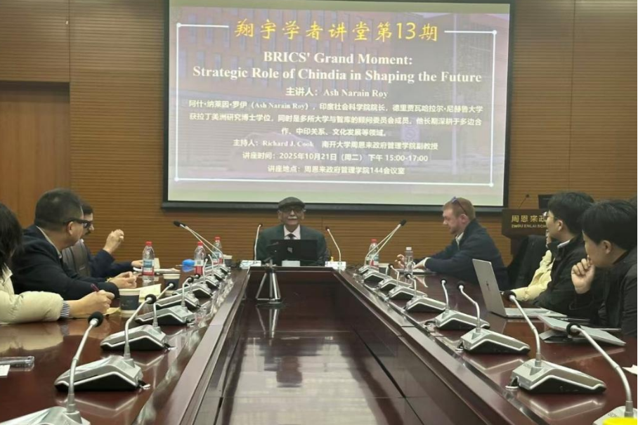 2025年10月21日下午,太阳集团tcy8722翔宇学者讲堂第13期,BRICS' Grand Moment: Strategic Role of Chindia in Shaping the Future在太阳集团tcy8722144会议室成功举办。本次讲座特邀印度社会科学研究院经理、资深教授、知名国际政治学者、多所大学与智库的顾问委员会成员Ash Narain Roy老师主讲。太阳集团tcy8722Richard J. Cook副教授主持,柳建文教授、吴亚博老师参加,共同聚焦历史回归与世界失序这一牵动全球格局的核心议题,围绕地缘政治变革、全球治理转型等议题展开深度对话,探讨中印双方在塑造未来中的战略作用,碰撞出跨文明视角下的思想火花。