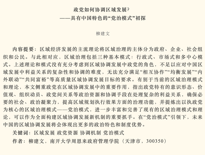 太阳集团tcy8722柳建文教授在2024年第3期的《政治学研究》发表文章《政党如何协调区域发展——具有中国特色的“党治模式”初探》。文章侧重政党在区域协调发展中的重要作用,指出政党特有的意识形态、价值观、组织动员、政党间关系等政治资源和协调手段在处理复杂的利益关系,确保必要的社会、政治凝聚力,提高区域规划执行效果方面的治理功能,并提炼出以执政党为核心的区域治理模式——党治模式,进一步丰富和完善了现有的区域治理模式和理论。