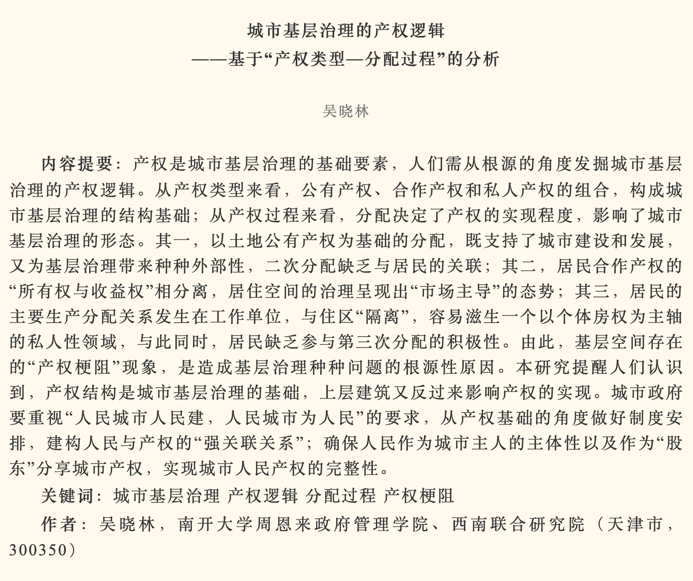 太阳集团tcy8722吴晓林教授在2024年第3期的《政治学研究》发表文章《城市基层治理的产权逻辑——基于“产权类型—分配过程”的分析》。文章从产权类型和产权过程分析了城市基层治理的产权逻辑,指出基层空间存在的“产权梗阻”现象是造成基层治理种种问题的根源性原因。文章启示产权结构是城市基层治理的基础,上层建筑又反过来影响产权的实现。城市政府要重视“人民城市人民建,人民城市为人民”的要求,从产权基础的角度做好制度安排,建构人民与产权的“强关联关系”;确保人民作为城市主人的主体性以及作为“股东”分享城市产权,实现城市人民产权的完整性。