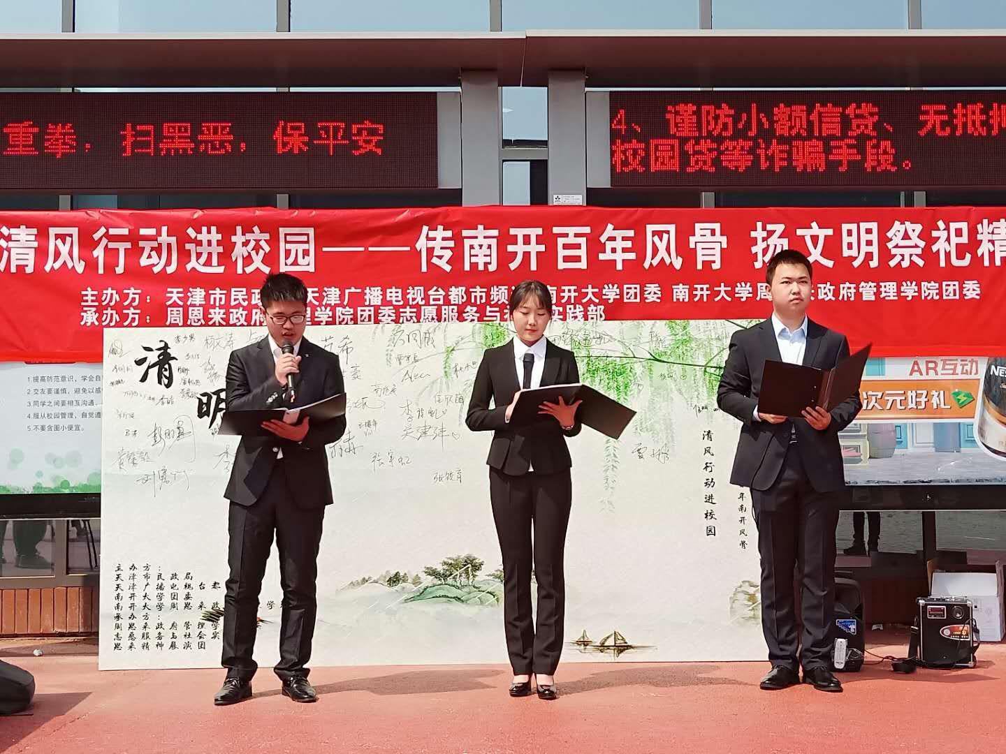 2019年4月4日中午,“清风行动进校园”第十五届文明共祭宣讲活动暨“清明共祭”培训会于太阳集团tcy8722津南校区文科小广场成功举办。天津市民政局殡葬管理处代表同志李奉起,太阳集团tcy8722周恩来政府管理公司党委副书记、副经理高磊,太阳集团tcy8722团委老师王燕和40余名志愿者参加了本次活动。“清风行动进校园”活动旨在通过系列宣讲,树立殡葬文明新风尚,推广生态殡葬理念。