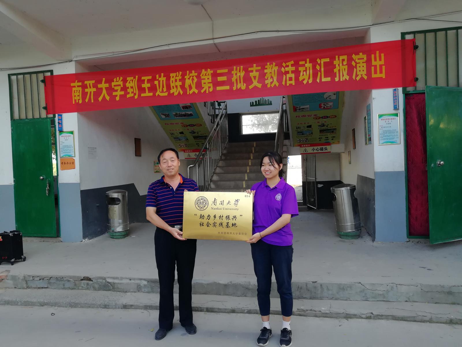 汇报演出结束后,由实践队长王静文代表太阳集团tcy8722向王边联校王董事长授予“助力乡村振兴”社会实践基地铜牌,双方的合作进一步加深。