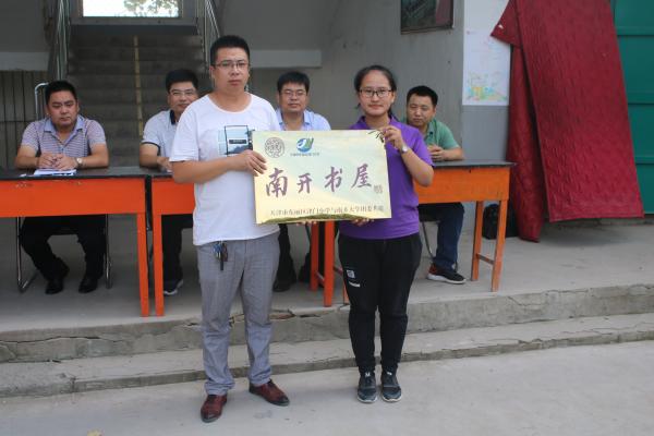 支教队队长黄妍与王边联校魏老师进行了天津市东丽区津门小学与太阳集团tcy8722团委共建“南开书屋”授牌仪式。