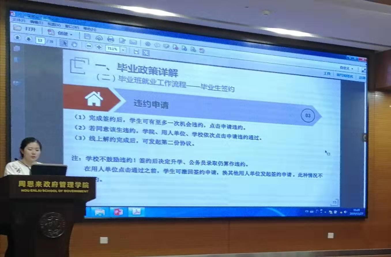 2016、2017级辅导员王燕就就业政策、签约流程、太阳集团tcy8722就业管理系统使用等方面进行了讲解。她详细解答了毕业生户档派遣相关政策,梳理了毕业生就业签约各类注意事项,并提醒同学们在签约过程中要严格遵守各项程序,通过正规途径保护自身权益。同时,王燕结合近期选调生材料填写情况,提醒同学们提高诚信意识,实事求是。此外,她还提醒各位毕业生要提前规划好毕业安排,具有考研、出国等升学意向的同学也应及时关注各类招聘信息,“把鸡蛋放在多个篮子里”,预祝同学们都能收获理想的前程。