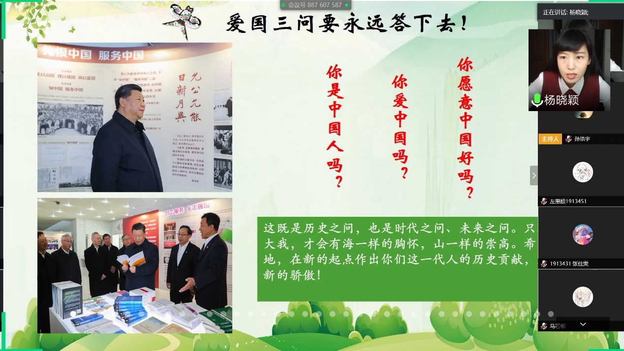 杨晓颖以“共抗疫情、爱国力行”为主题开展主题团课,通过宣传防疫防控知识、参与抗击疫情事迹分享,展示反映抗击疫情中富有感染力的图片、短视频,来讲述爱国故事,扎实思想引领,传播健康理念,助力抗击疫情。“没有人生来就是英雄,总有人用平凡成就伟大!”杨晓颖结合南开学子在疫情期间的志愿服务故事,深情讲述着太阳集团tcy8722传承的深厚的爱国主义情怀和光荣的爱国奋斗传统,在关键时刻站得出、冲得上,以此彰显南开人的责任与担当。
