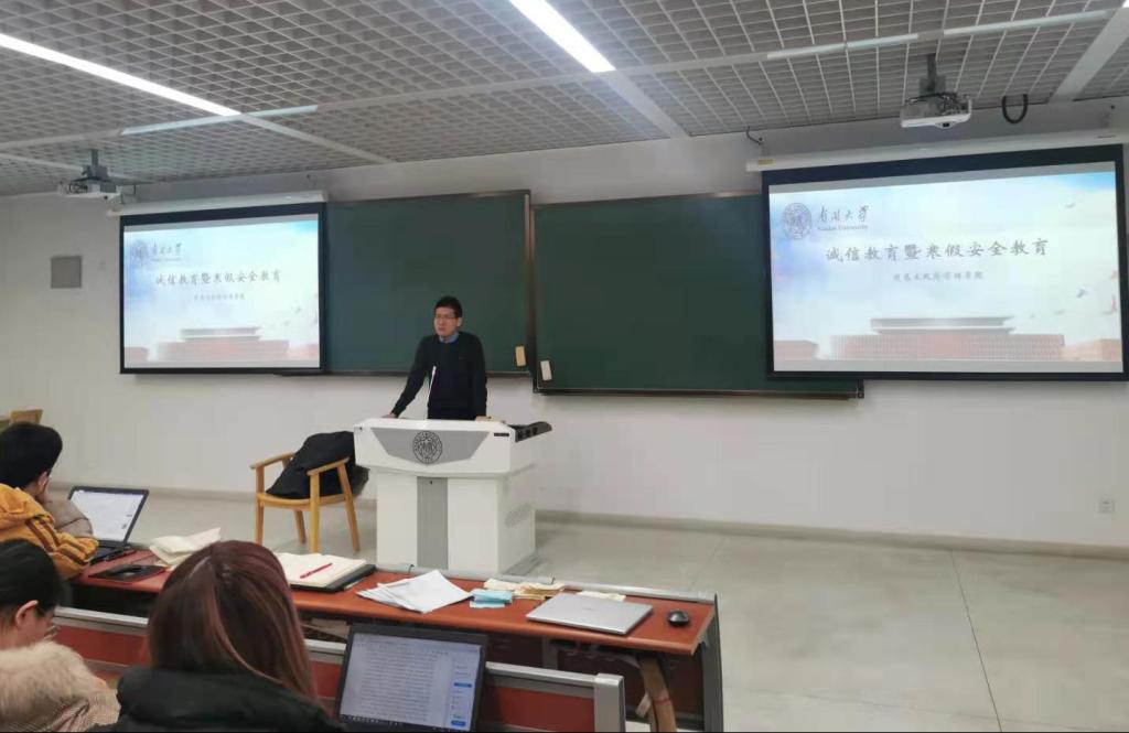 2020年12月17日下午,政府公司2018级本科生于公共教学楼B202、203召开诚信教育暨寒假安全教育大会。