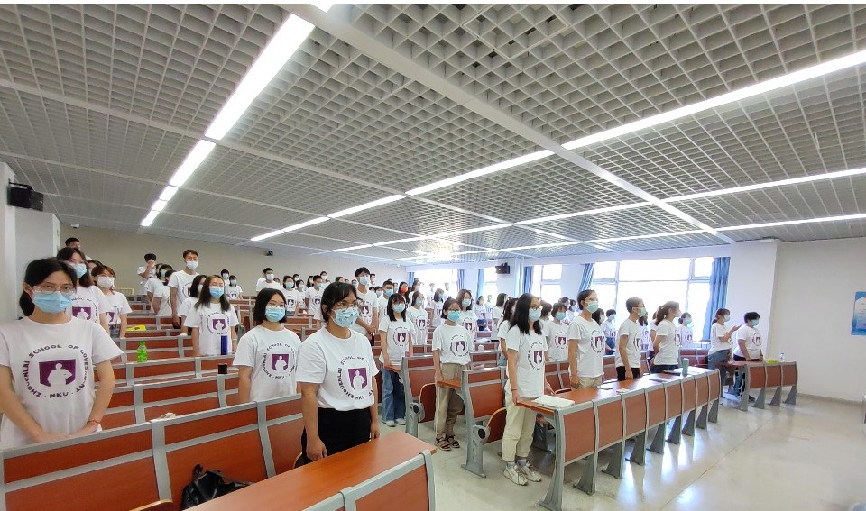 随后,全体同学在2021级本科新生代表于昊正的带领下,诵读南开容止格言:“面必净,发必理,衣必整,纽必结;头容正,肩容平,胸容宽,背容直。勿傲,勿暴,勿怠;宜和,宜静,宜庄。”