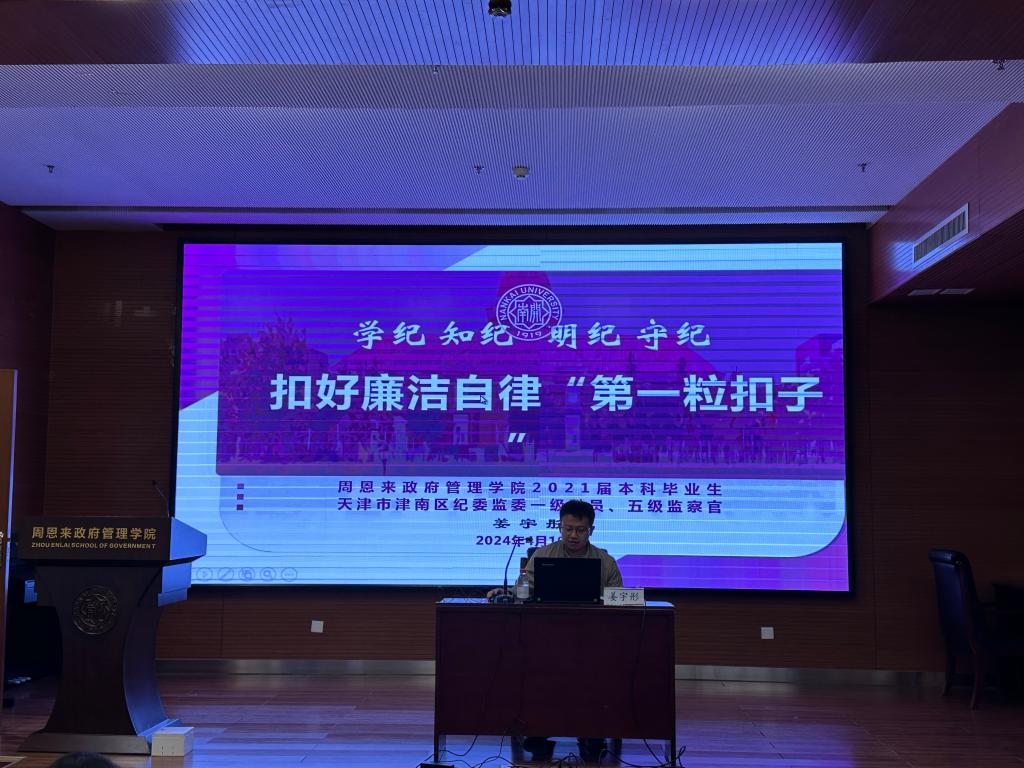 本次党课邀请2021届本科毕业生、天津市津南区纪委监委姜宇彤作为主讲嘉宾。他首先从我国纪检监察机构的历史沿革出发,向师生们介绍了我国监察体制的改革和发展历程,让大家对纪检监察工作的重要性和必要性有了更深刻的认识。