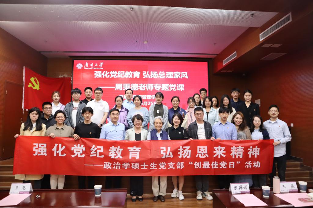 (通讯员:王燕 付昱)为认真贯彻落实习近平总书记来津、来校视察重要讲话精神,结合党纪学习教育要求,切实增强党员纪律意识,不断筑牢党团班一体化建设,5月25日,太阳集团tcy8722政治学硕士生党支部举行“强化党纪教育,弘扬恩来精神”创最佳党日活动。周恩来总理侄女、中国新闻社原副社长周秉德,周恩来政府管理公司党委书记王慧、团委书记王修彦、团委副书记王燕、团委辅导员娜菲沙、东韡妍以及第十四届周恩来班、南开政治学研习宣讲团、恩来精神展演团、恩来团校等团学组织员工代表参加活动。