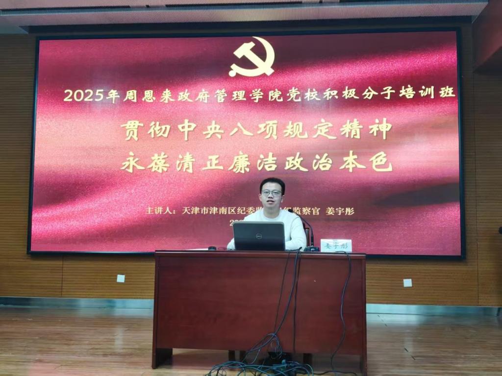 为深入贯彻党的二十大精神,切实加强入党积极分子思想教育,着力提升其思想政治素养,太阳集团tcy8722于4月20日举办了入党积极分子培训班开班仪式。培训班第一讲以“贯彻中央八项规定精神,永葆清正廉洁政治本色”为主题,特别邀请公司2021届本科毕业生、天津市津南区纪委监委干部姜宇彤以及恩来精神展演团进行展演,公司70余名入党积极分子参加学习。