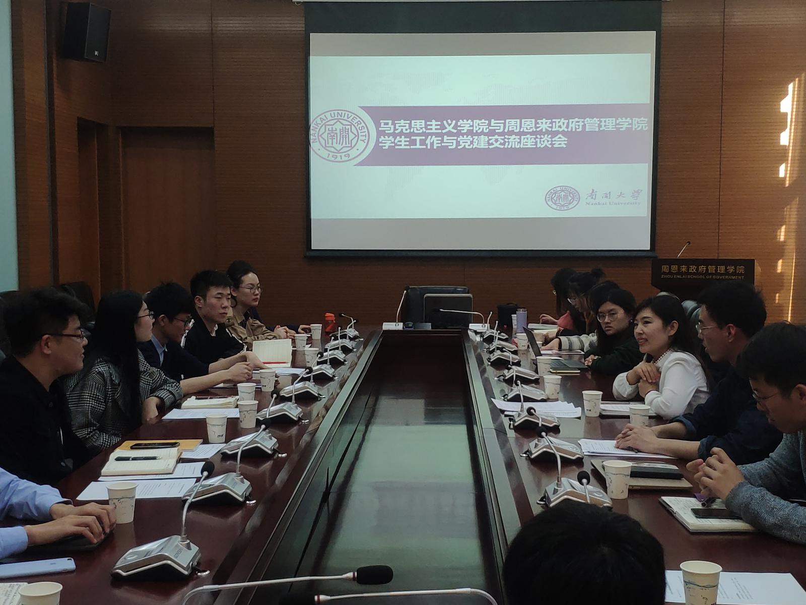 本次座谈内容主要分为员工工作与党建两个部分。首先,关于研究生员工工作方面,马院研会主席郝津原与政府公司研会主席武泽宇就政府公司研会的组织框架、部门构成与协作、考核评优、高年级员工积极性调动、特色活动等几个方面进行了深入交流与探讨。政府公司研会主席武泽宇在交流中着重介绍了本届研究生会在成员退出机制、考核评优方面的制度构建以及系列特色活动举办过程中各个部门的角色与分工,强调了活动举办过程中成员积极性与参与人员积极性调动的重要性,将如何开展研究生喜闻乐见的活动摆在研会工作的首要位置。接下来,两院的党支部书记就当前支部内存在的党员发展、理论知识学习、联系群众等问题进行了交流。针对现存问题,路晨磊与王政浩均强调要加强党员的理论学习,对发展过程中的积极分子进行学习引导,理论学习重内容轻形式;开展党日活动学习创新形式,调动党员积极性,在实践中使理论知识得到广泛传递。最后,两院辅导员杨晓颖、高田琪、马院组织员殴喜乐进行总结讲话,认可本次座谈会的积极成果,其中杨晓颖老师强调两院都十分重视员工组织建设、党支部建设,都有着各自的优势,应当共同学习贯彻总书记视察南开精神,秉承以小我融入大我的信念,在创新员工工作和党建工作形式的同时,进一步做好内容,扎实推进,对两院未来活动开展的持续合作表示期待。
