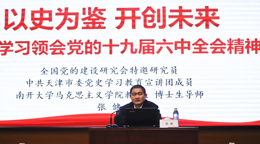 张健主要从党的十九届六中全会的议程和重大意义、全会通过的《决议》内容安排上的特点、中国共产党百年奋斗的伟大成就和意义、全会突出强调的“两个确立”“十个坚持”以及“牢记初心、担当使命,埋头苦干、勇毅前行”五个方面对十九届六中全会精神进行了深入解读。