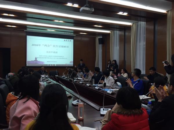 随后,关信平教授就今年“两会”议题分别进行深入分析。社会保障议题方面,关信平教授认为划转部分国有资本充实社会保障基金是解决当前社会保险基金的可持续性问题的有效方法,城乡补助的标准需要提高。教育政策方面,教育公平和均衡发展,教育公益性是主要议题。医疗卫生政策方面,需进一步拓展医疗服务和医疗保险的改革,进一步推进公立医院改革。全面放开二孩政策方面,促进优生优育,提升儿童照料和儿科医疗的水平是主要关注点。扶贫开发方面,增加扶贫资金投入,定点扶贫,精准扶贫是热点议题。《慈善法》审议方面,关信平教授指出当前我国慈善事业能力弱不规范,应该调动慈善组织的积极性,并促进慈善规范发展。