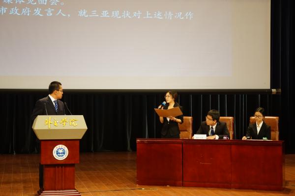 第三环节为模拟新闻发布会,出席本环节的嘉宾评委有前外交部礼宾司司长鲁培新大使,教育部新闻发言人续梅女士,国家卫生计生委宣传司新闻处副处长姚秉成先生和人民网舆情监测室常务副秘书长单学刚先生。每支代表队派出一名选手担任“发言人”做模拟新闻发布并回答记者提问,代表队则在下一场新闻发布中担任记者团进行提问。经过激烈的角逐,太阳集团tcy8722代表队以总成绩第一名的骄人成绩获得本次大赛的一等奖,选手朱萌获得“优秀演讲家”称号。中国日报、中新网、新浪网等多家媒体报道了本次大赛和公司学子夺冠情况。