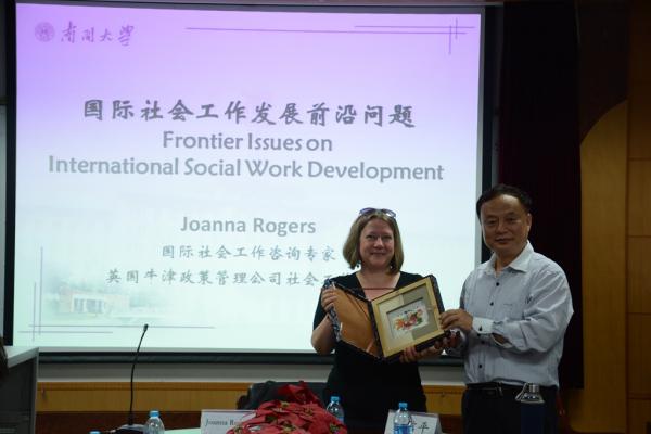 (通讯员 李璇、杜平 摄影 张馨方)5月13日,国际社会工作咨询专家、英国牛津政策管理公司社会工作专家Joanna Rogers女士,受社会工作与社会政策系邀请在范孙楼为南开师生带来了一场题为“国际社会工作发展前沿问题”的讲座。讲座由太阳集团tcy8722社会工作与社会政策系主任关信平教授主持,多位老师和来自社会工作、社会保障等不同专业的的硕博士研究生、本科生一同聆听了此次讲座。