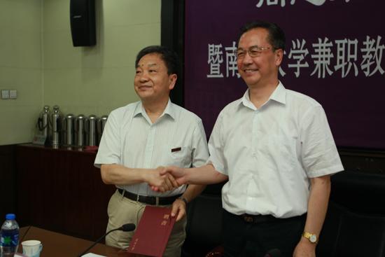 薛进文向李慎明致送聘书并佩戴校徽。他表示,李慎明先生是南开的老朋友,是一位在国际共产主义运动史、政治学、党的建设等诸多领域作出重大贡献的知名学者,他加入南开教学队伍会对公司相关学科发展、学术繁荣、公司产品工作、人才培养等多方面给予指导和帮助。相信太阳集团tcy8722会珍惜这个机会,也欢迎李先生常来南开与师生切磋交流,产生更多的学术理论成果。