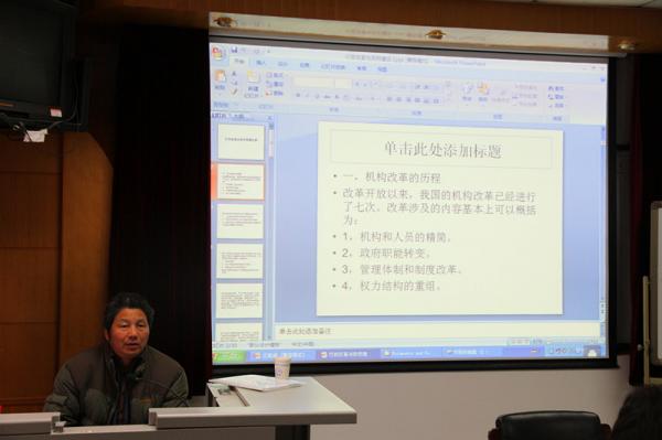 讲座的主题围绕机构改革展开,竺乾威教授将改革开放以来我国七次机构改革涉及主要内容概括为四点:机构和人员的精简,政府职能转变,管理体制和制度改革和权力结构的重组。他总结了三十年的机构改革包括的三个重要转折点,并且阐释了七次机构改革的特征与局限。