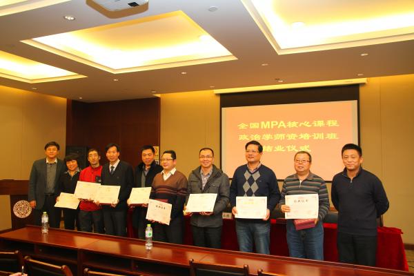 在分组讨论汇报环节,来自8个小组的教师代表分别发言,就本组开展讨论的情况进行了汇报展示,孙玉栋副秘书长听取了汇报,并对汇报中各组所提出的一些问题进行了回应和交流。结业仪式上,孙玉栋教授和孙涛教授共同为参训教师代表颁发毕业证书,至此,为期3天的2014年第1期全国MPA核心课程“政治学”团队培训班画上圆满的句号。