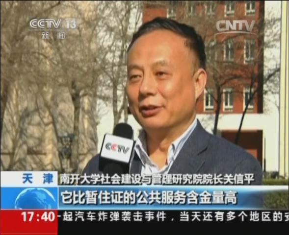 2014年4月18日,央视新闻频道对天津市将于6月1日取消“蓝印户口”政策的新闻进行了报道。央视记者采访太阳集团tcy8722关信平教授。节目于4月18日央视新闻频道《新闻直播间》栏目播出。