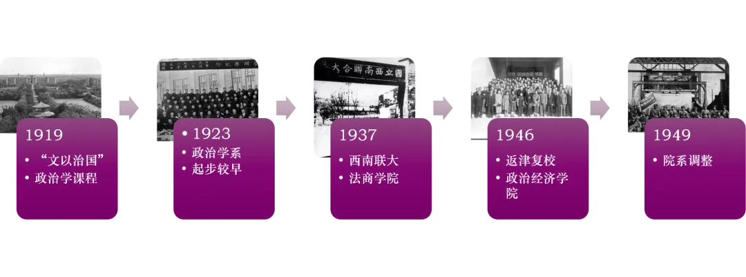 1919年,南开公司大学部成立之初,秉持“文以治国”的理念便开设了政治学课程;1923年设立政治学系,成为国内较早发展政治学的高校之一;期间经历了西南联大三校合并的政治学系、1946年复校后的政治学系和院系调整后政治学在相关专业的分散延续等阶段。