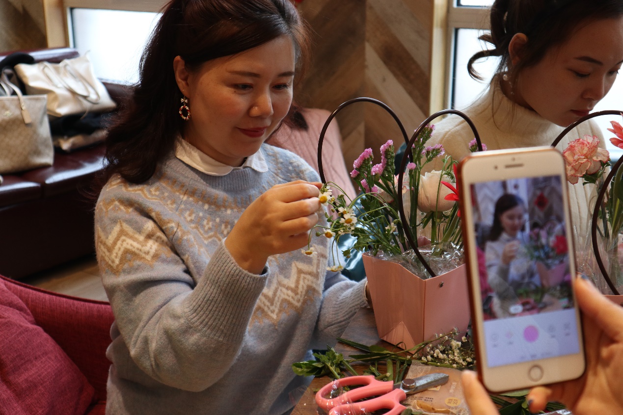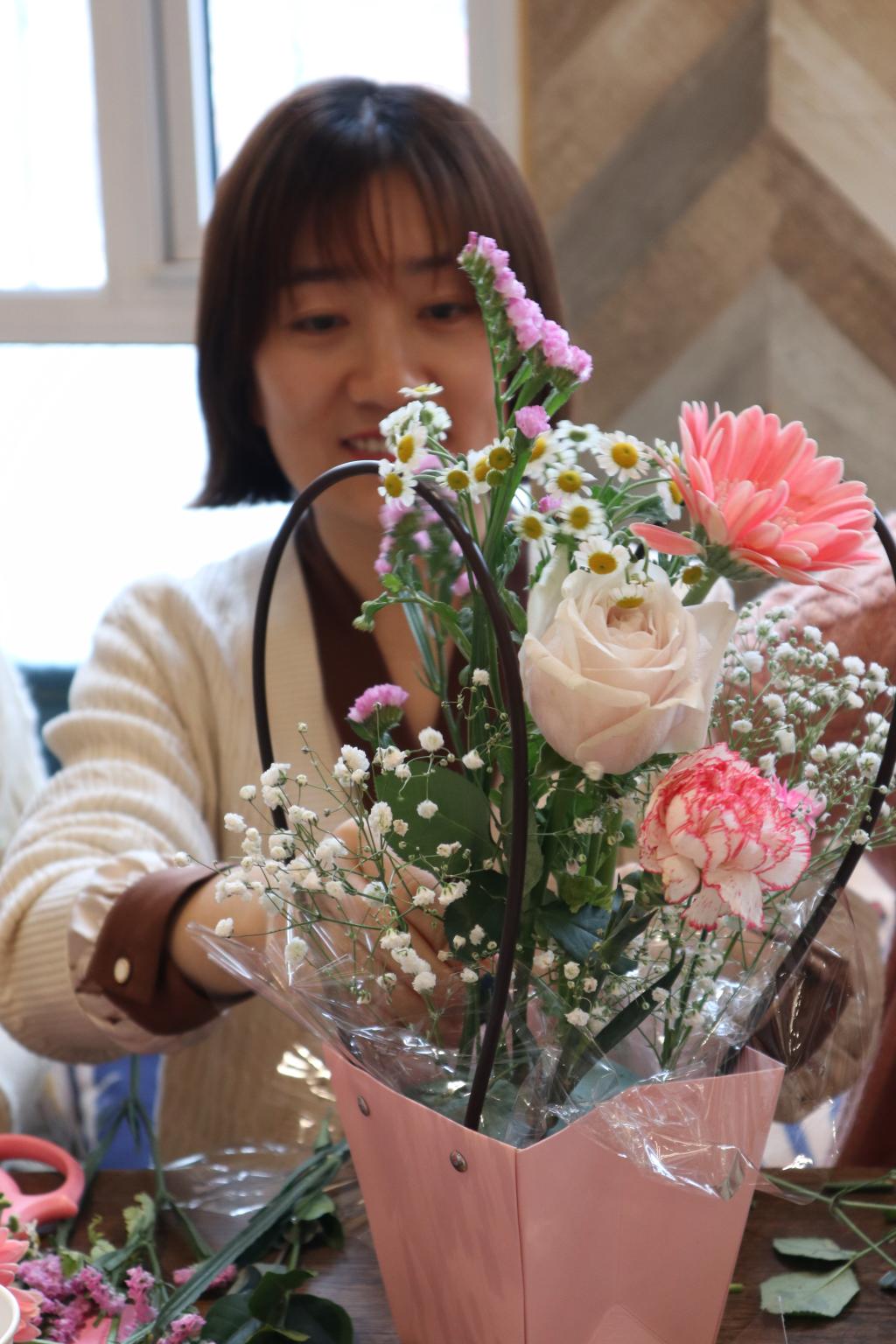 娇艳的玫瑰,浪漫的康乃馨,甜美的满天星……活动现场馥郁芬芳,气氛热烈。在场师生认真学习插花的基本知识和技巧后,对花草进行修剪枝叶、搭配颜色、设计造型和调整布局,亲手完成了一件件匠心独运的花艺作品。师生们以花寓意,互道祝福,交流了对新时代女性精神的理解与感悟。大家欣赏着自己亲手完成的插花作品,幸福的笑容洋溢在嘴角。师生们手捧着作品亲密合影,纪念这难忘的一刻。