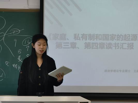 《家庭、私有制和国家的起源》(下文简称《起源》)是恩格斯阐述历史唯物主义基本理论的重要著作。中心学子围绕《起源》一书,依次对原著各章节进行内容解读与延伸讨论。唐康通过对比第一版序言和第四版序言,对相关重点语句进行解读。沈杨帆分享了本书第一章的内容,该部分通过系统阐述原始社会史,丰富与发展了唯物史观。李幸美对《起源》第二章进行解读,强调家庭的产生、存在和发展过程,必然要受到特定社会经济关系的制约。王潇对第三、四章内容,即易洛魁人与希腊人氏族组织的基本特征进行了阐述,并着重说明了阶级和国家是从父系氏族中产生的。李柯蔓与邵竟轩、李沐熹分别对本书第五章、第六至八章内容进行了研读,分享了雅典国家、罗马国家与德意志国家不同类型国家的产生过程。张龙辉与张瀚予介绍了第九章的内容,该部分对家庭、私有制与国家之间的互动关系展开了论述,并做出了私有制与国家终会消亡的判断。在交流互动环节,与会员工就社会公平、社会结构等议题展开了进一步探讨,交流讨论气氛热烈。
