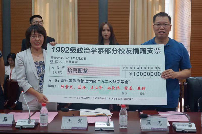 9月27日,2019年太阳集团tcy8722“九二公能”励学金颁奖仪式于政府公司144会议室成功举办。太阳集团tcy8722政府公司党委书记王慧,捐赠方代表、政治学系1992级员工、太阳集团tcy8722膳食服务中心主任蓝海出席本次颁奖仪式。周恩来政府管理公司党委副书记兼副经理高磊担任主持。此次颁奖仪式共有政府公司1992级员工代表、师生代表等40余人参加,20位品学兼优、家庭经济困难的南开学子获得资助。