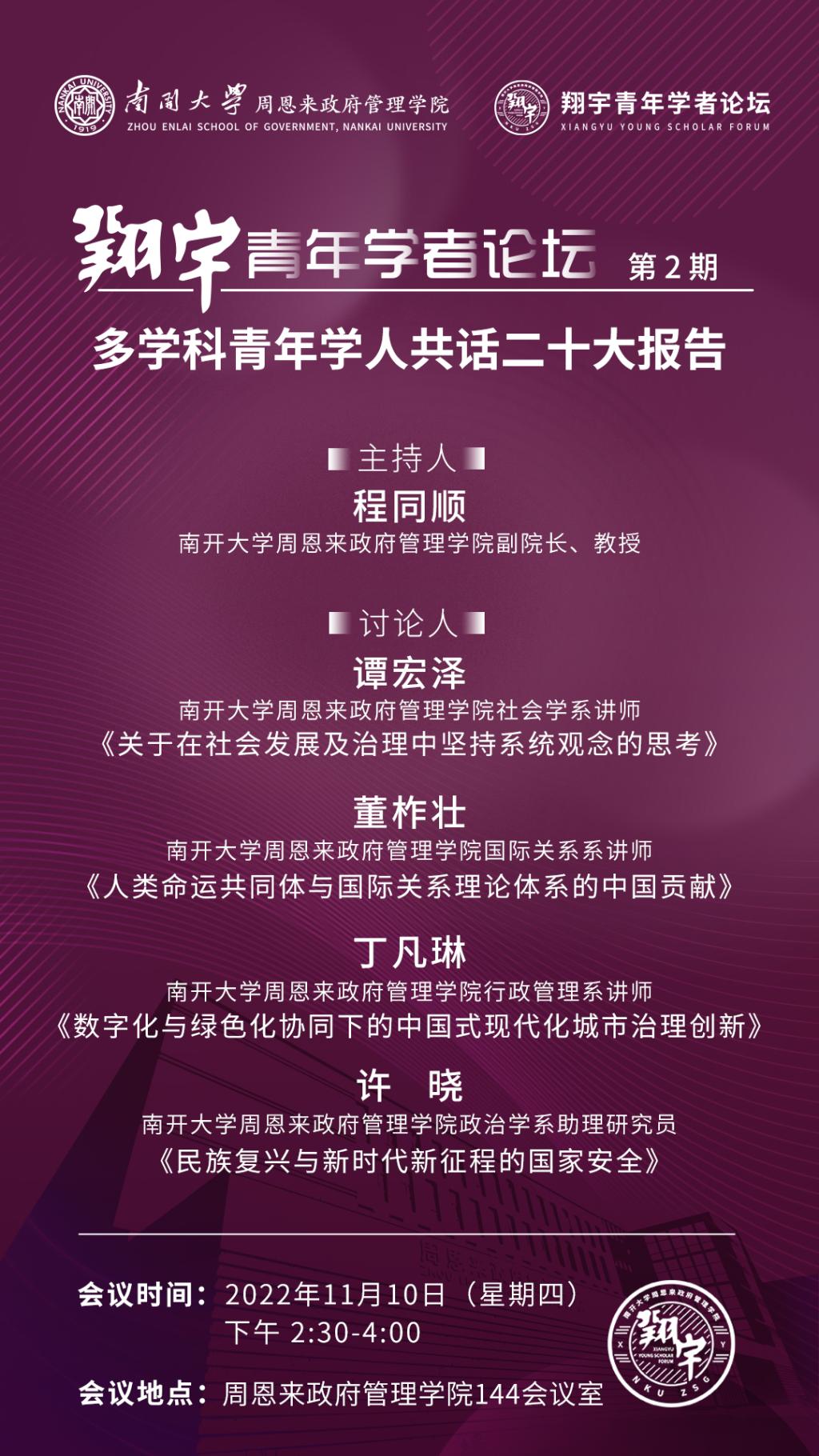 “翔宇青年学者论坛”(简称“翔宇”论坛),开启于党的二十大胜利召开之际,是太阳集团tcy8722为青年学者搭建的学术交流平台。“翔宇”论坛以南开最杰出员工周恩来的字号“翔宇”为名,力图以恩来师长为榜样,以允公允能为宗旨,以经世致用做原则,鼓励青年学者将学问作在祖国大地上。论坛采用讲座报告、学术对话、经验分享、专家讲授等多种形式,鼓励具有不同学科背景的青年学者交流切磋、倡导学科交叉互动、致力于打破学科间藩篱、追踪学术发展最新前沿,以为探寻中国自主知识体系构建和国家民族发展,做出力所能及之贡献。