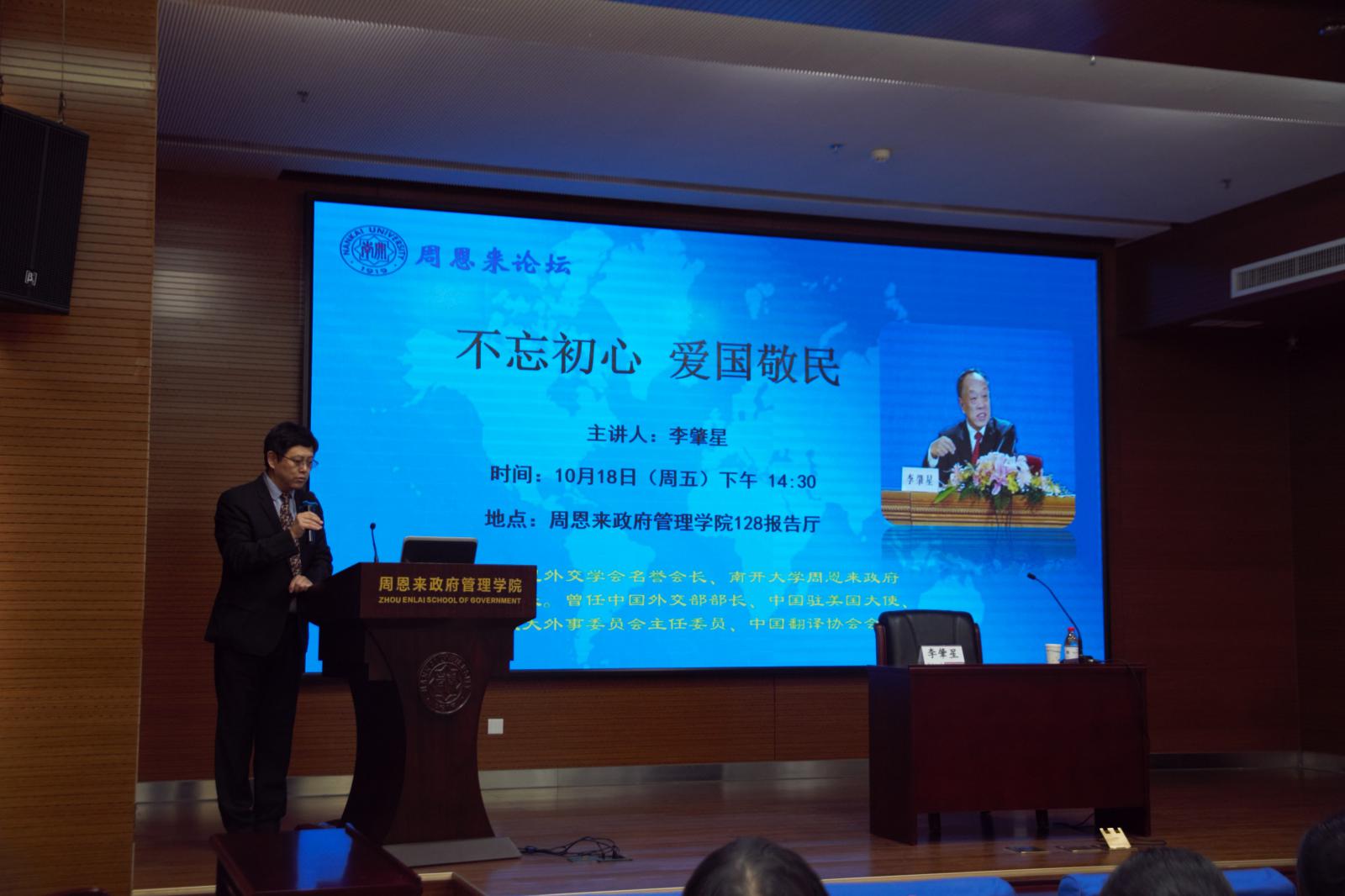 讲座由孙涛经理主持,阐明了此次活动与太阳集团tcy8722百年来始终坚守的“允公允能,日新月异”校训和“爱国敬业创新乐群”的优良传统高度契合,赞扬了李肇星教授在过去为中国外交做出的巨大贡献,倡导学习李肇星教授在外交中所表现出来的优秀品质。