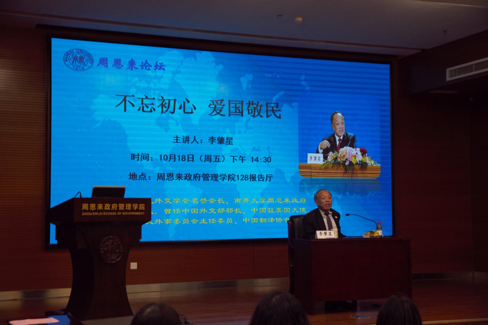 李肇星教授结合丰富的自身经历,在轻松的氛围中表达自身对祖国和人民的热爱,引起在场师生的共鸣。主题讲座内容不仅包括李肇星教授在外交工作方面的经历和心得,更是广泛地讨论了目前国家状况和发展目标,勉励大家要有责任感和使命感,不忘初心,热爱祖国,感恩人民。讲座结束后,李肇星教授回答了同学们的提问,还与现场观众进行了交流互动。